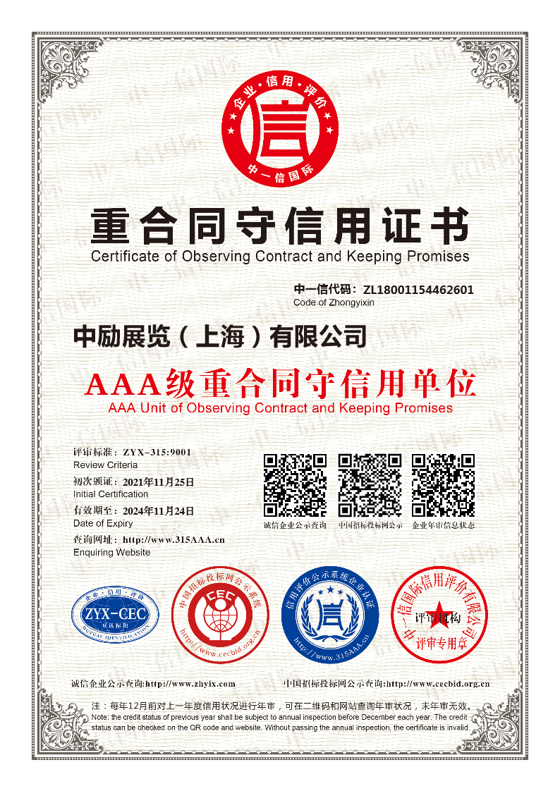 We have also received a thank-you letter from the China International Import Expo Bureau, an AAA level honest supplier, an AAA level certificate of quality and trustworthiness, ISO9001 quality management system certification, ISO14001 environmental management system certification, a first-class qualification certificate for integrated exhibition engineering design and construction, a member unit of the Rural Revitalization Construction Committee, and the China Exhibition Industry Golden Finger Award – Top Ten Innovative Design Institutions Award, further demonstrating our achievements in pursuing excellence and becoming a trustworthy comprehensive exhibition and display service provider.