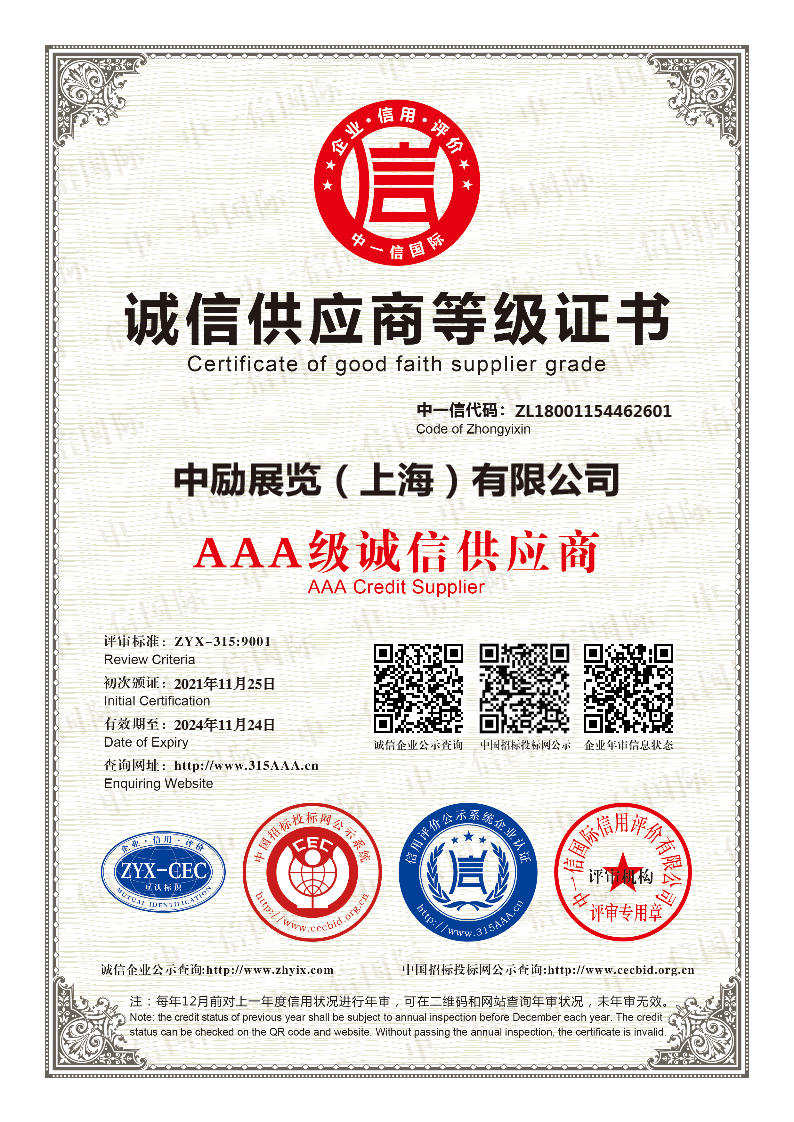 We have also received a thank-you letter from the China International Import Expo Bureau, an AAA level honest supplier, an AAA level certificate of quality and trustworthiness, ISO9001 quality management system certification, ISO14001 environmental management system certification, a first-class qualification certificate for integrated exhibition engineering design and construction, a member unit of the Rural Revitalization Construction Committee, and the China Exhibition Industry Golden Finger Award – Top Ten Innovative Design Institutions Award, further demonstrating our achievements in pursuing excellence and becoming a trustworthy comprehensive exhibition and display service provider.